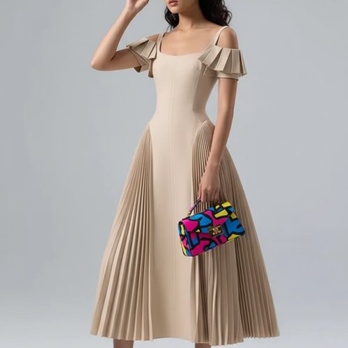 The design featuring a delicate strap silhouette and backless design comes together to create a sophisticated and sexy party look. The art of patchwork at the waist adds an avant-garde touch, while the flowing, pleated skirt moves with grace. It's the ideal dress for summer nights or any event where fashion is the protagonist.